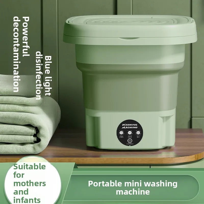 Do laundry anywhere with ease! This 8L portable foldable mini washing machine is perfect for delicates, underwear, baby clothes, and small loads. Its removable basket, efficient drain, and built-in LED light make washing simple and convenient—even in tight or dark spaces.